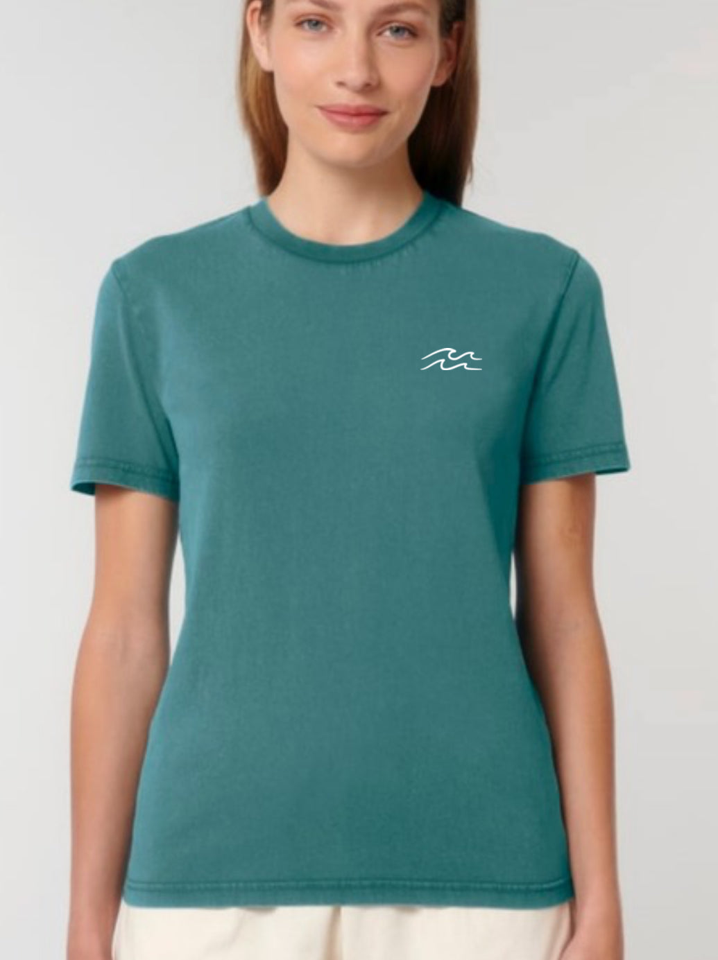 Für den perfekten Surfer-Look kommt das Shirt in einem wunderschönem Türkiston in Vintage-Optik, das heißt die Farbe ist unregelmäßig eingefärbt und sieht aus, als trägst du es schon seit Jahren an salziger Meeresluft.